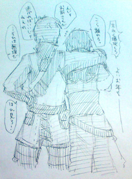 描きおさめは例の如くグレロンです。アナログ。紅白も終わりそうな時間なので大急ぎです。今年は駄目人間こじらせて傭兵剣士もこじらせていろいろ余裕の無い一年でした。当面はとりあえずデジタル環境の復活を目標に頑張りたいです…こ、更新も…。そんでは来年もよろしくお願いしますよいお年を。